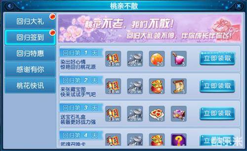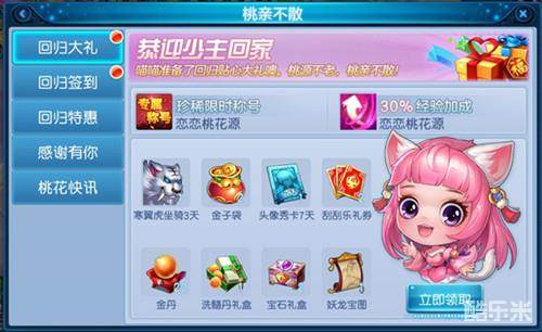 回归首日即可领取贴心大礼包,专属豪礼任性送!海量金子、限时寒翼虎坐骑、宝石礼盒、珍稀称号“恋恋桃花源”等你来拿!非新服回归玩家还可享受超强回归BUFF,加速升级不掉队!