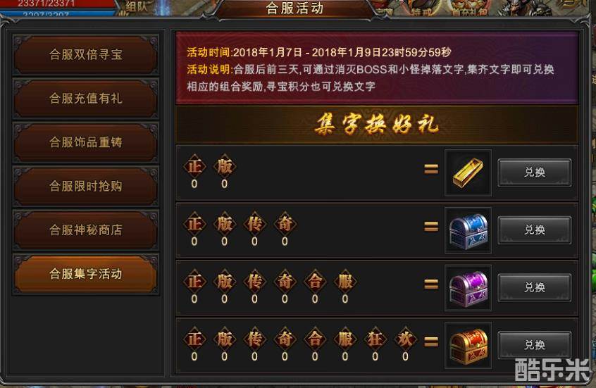 活动说明: 合服后前三天,可通过消灭BOSS和小怪掉落文字,集齐文字即可兑换相应的组合奖励,寻宝积分也可兑换文字