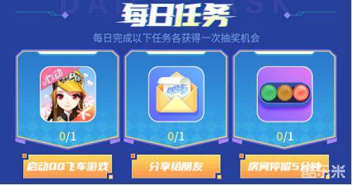 登录Hello语音打开活动界面,完成每日任务,即可参与抽奖活动。每天通过启动QQ飞车游戏、分享活动给朋友、房间停留5分钟等都可以获得一次抽奖机会,每日最多可获得3次抽奖机会。