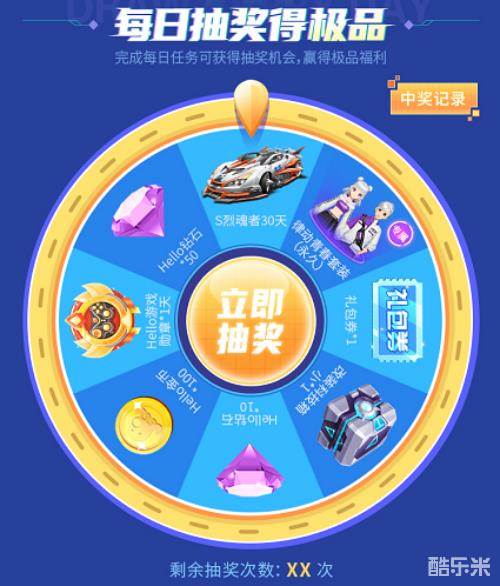 通过每日任务获得的抽奖机会,可用于每日抽奖,这是一个全凭运气的活动。在奖池中,有着多重好礼可被抽取,比如说律动青春服饰(永久)、S猎魂者(30天)、礼包券、改装科技箱、Hello钻石、Hello金币、Hello游戏勋章等精美礼品都可在抽奖中获得。