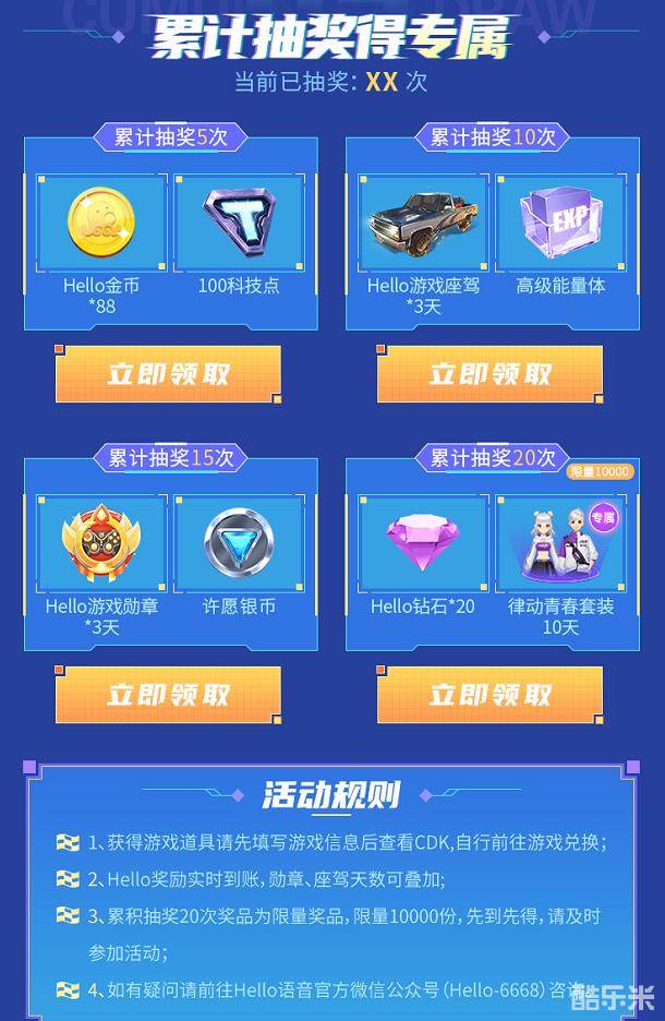此外,还有累计抽奖得专属的活动。玩家通过累计抽奖次数也可以免费领福利,累计抽奖5次可获得Hello金币*88、100科技点;累计抽奖10次可获得Hello游戏座驾*3天、高级能量体;累计抽奖15次可获得Hello游戏勋章*3天、许愿银币;累计抽奖20次可获得Hello钻石*20、律动青春套装10天。