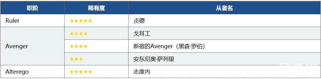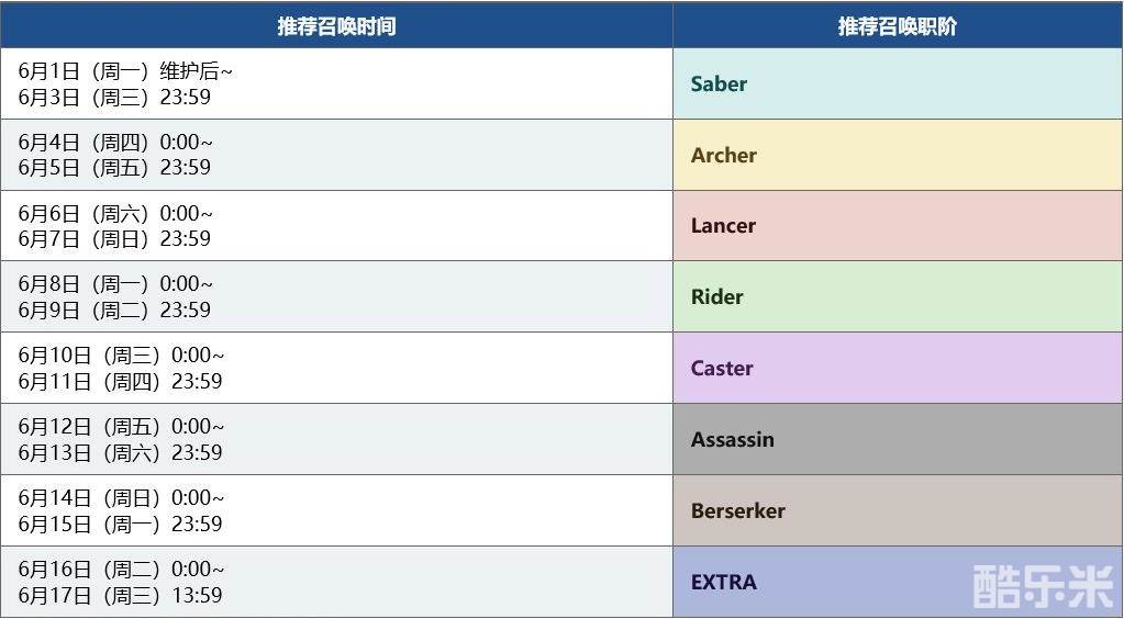 「职阶区别推荐召唤(每日替换)」为确定职阶的每日替换卡池,只有属于推荐召唤职阶的从者才可被召唤。