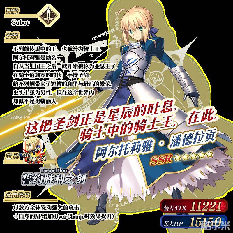 ※以上的「★5(SSR)阿尔托莉雅·潘德拉贡(Saber)」的立绘为灵基再临第2阶段。