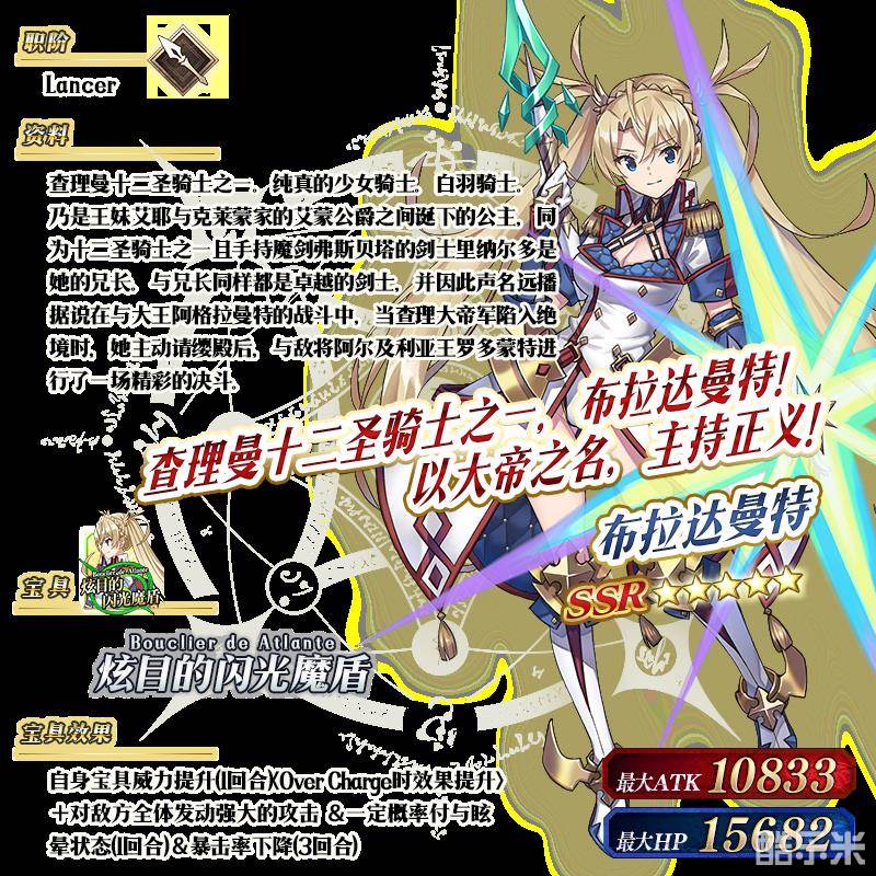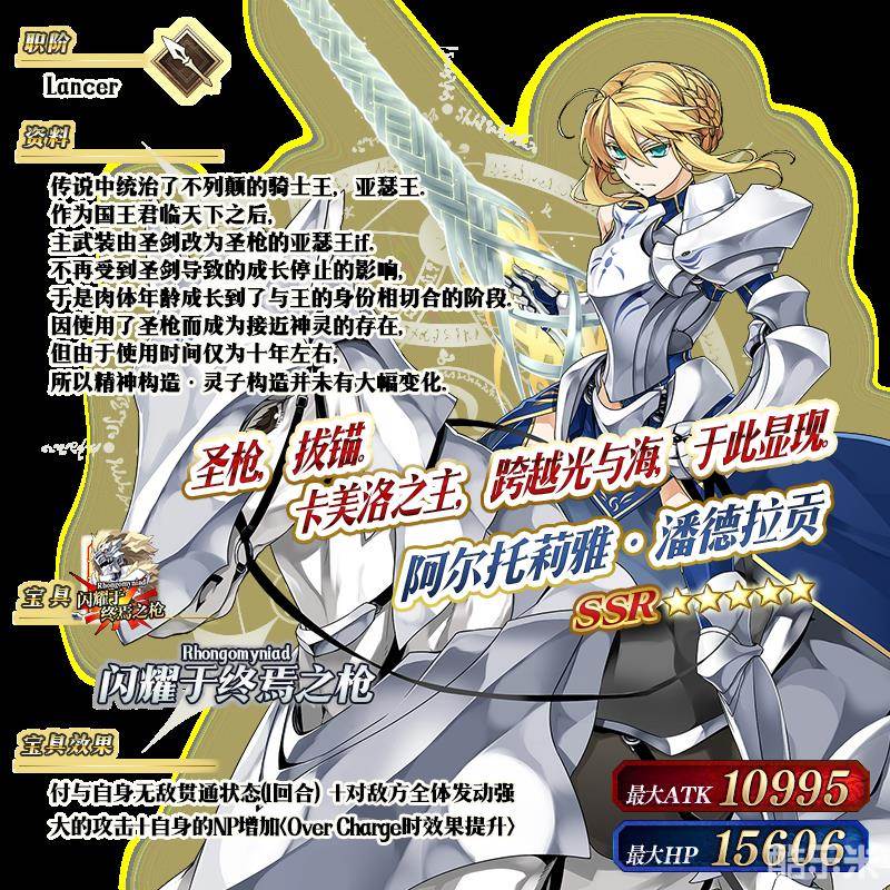 ※以上的「★5(SSR)阿尔托莉雅·潘德拉贡(Lancer)」的立绘为灵基再临第2阶段。