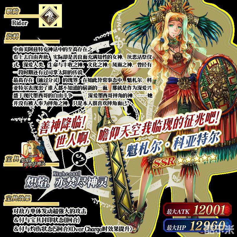 ※以上的「★5(SSR)魁札尔·科亚特尔(Rider)」的立绘为灵基再临第2阶段。