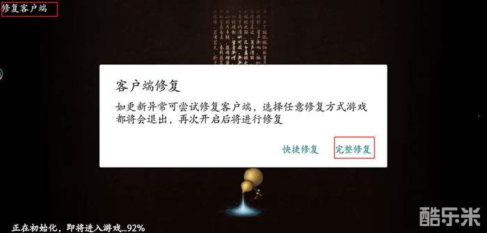 方法二:进入游戏资源更新界面——点击左上角“修复客户端”——点击“完整修复”后即可