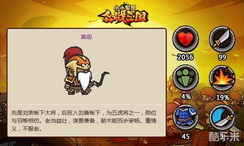 黄忠原是刘表帐下大将,后投入刘备帐下,为五虎将之一,勋位与羽等相仿。老当益壮,谋勇兼备,箭术能百步穿杨。重情义,不服老。在《小小军团合战三国》中可通过拜访名城“襄阳”获得。