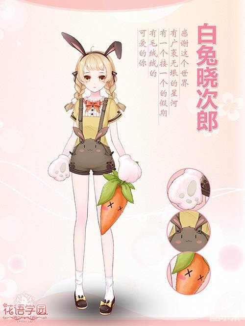 在最近一部很火的动画电影里,带头大哥小白兔可谓是颠覆了大家对兔子温顺可爱的传统印象。不过兔子到一直是最常见最受人喜爱的宠物之一。白兔晓次郎套装(设计者:热心玩家寒夜和白娘)还是一直温顺可爱的小兔子,背带裤一直都是萝莉的最爱之一,加上兔耳发箍、抱枕和兔掌,确实是扮萌减龄的利器。