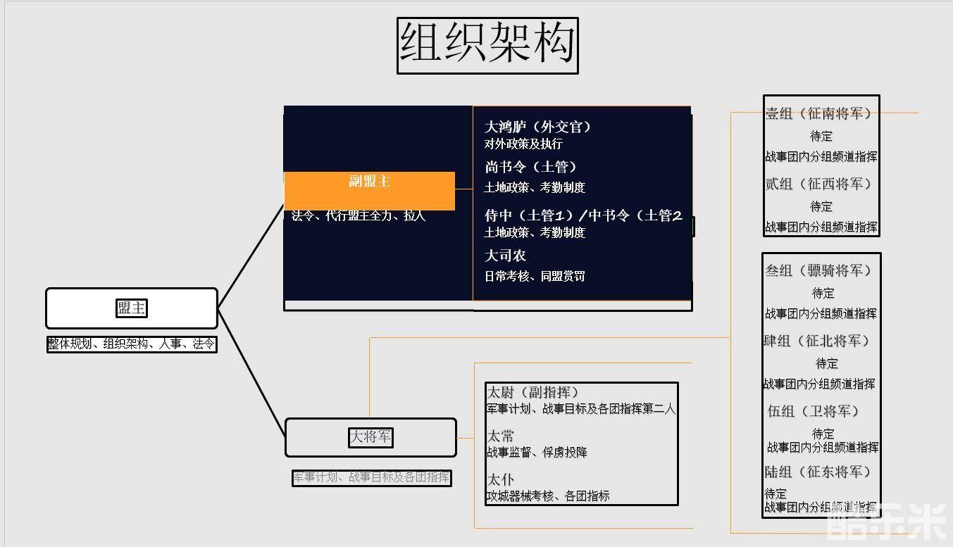 不管是为了完成各个阶段的游戏目标,还是分组进行管理,都始终离不开领军的人物,古代战场亦是如此。一个同盟之所以强大,和盟中的管理层脱不开关系。反过来说,若是同盟缺少所谓的管理核心,那就是一盘散沙。再换句话来说,所谓的同盟就好比一家公司,需要适合的管理架构作为基础,从而形成点对点或者点对面的管理。