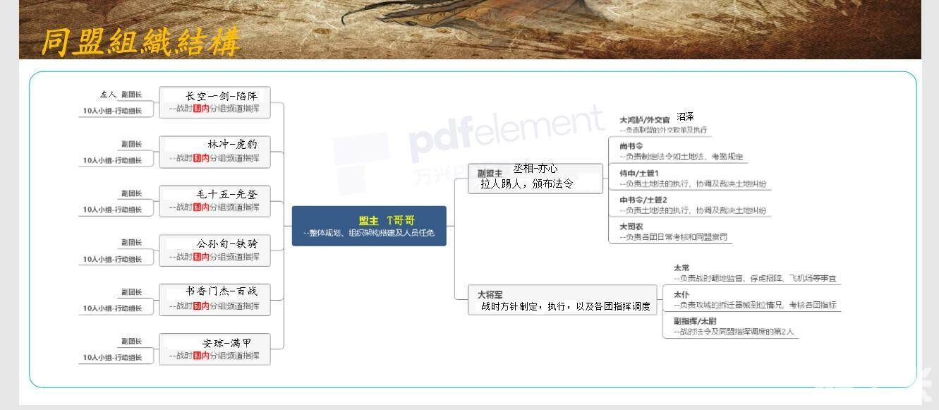 这种三级管理架构绝非唯一,也并非最完美的一种架构形式。每一个同盟完全可以根据内部的实际情况,进行合理的安排与配置。与此同时,各位主公也可根据职责取一些霸气的职名,这要远比副盟主、外交官什么的称谓更有感觉。举个例子,拿486区的某个同盟来说,副盟主名为丞相,外交官又名大鸿胪,土管分为尚书令、侍中和中书令,指挥官则为大将军等。再比如624区某盟,给团长也赋予了响当当的名号,诸如征东将军、征西将军一类。一个合适的称谓,不仅能让各个职位变得更加正式,还能营造出古代战场的氛围,尤为值得借鉴。