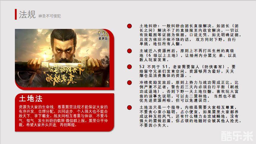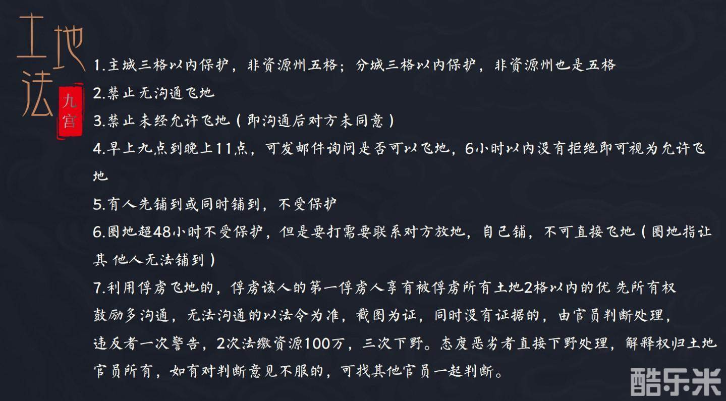 以上土地法的制定为一名精英盟主所制,执法效用甚为明显,不仅能妥善解决盟员之间的土地纠纷,还能合理保护盟员的土地所有权,值得一些萌新主公学习和借鉴。当然,土地法的制定和考勤法一样,还得讲究对症下药。