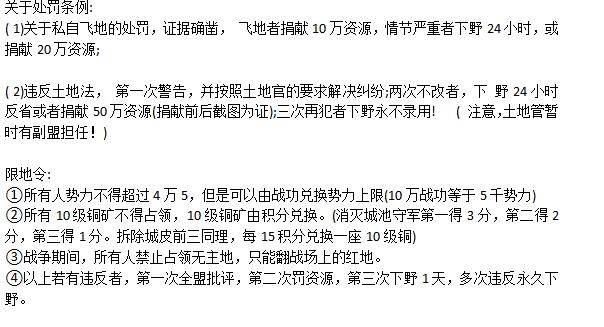 基本领地的借用原则:倘若需要临时借用周边其他盟员基本领地内的高等级土地,应事先私下沟通,征得对方同意方能占领;飞地也需要提前私聊,允许发送超过3小时(夜晚5小时)内对方没回复可以直接飞地(打架、攻城、中转和关口集合除外);作战州飞地打架没有飞地限制,但凡过了土地免战期即可;借地后在该同盟成员具备独自占领能力并提出归还后,应当在收到归还提醒的第一时间弃地归还,最迟不得超过5小时。