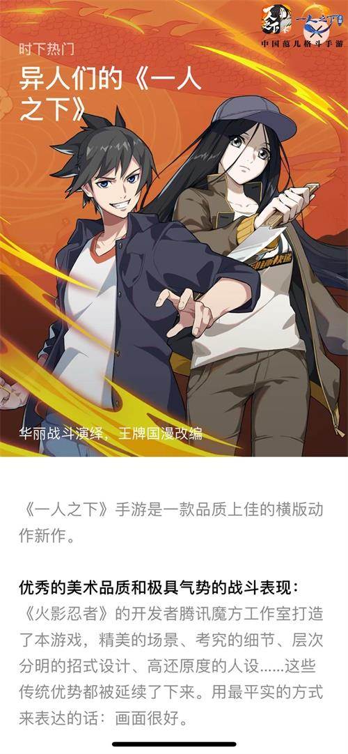 一招一式皆有道!中国范儿格斗手游《一人之下》手游现已全平台上线。手游是由同名国产动漫IP改编的横版格斗手游,精心打造了天师府、武侯奇门、湘西巫蛊、蓬莱夜刃、贾家村中国传统门派,为粉丝们提供具有“中国范儿”的激爽国术格斗。玩家在此还可以探寻漫画隐秘剧情,揭开异人世界隐藏的秘密!
