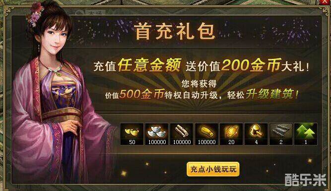 活动内容:活动期间只要充值任意金额,即可获得50金币、粮食、银币、木材各10万、募兵令20个、黄金锤4个、丹书铁券2个!