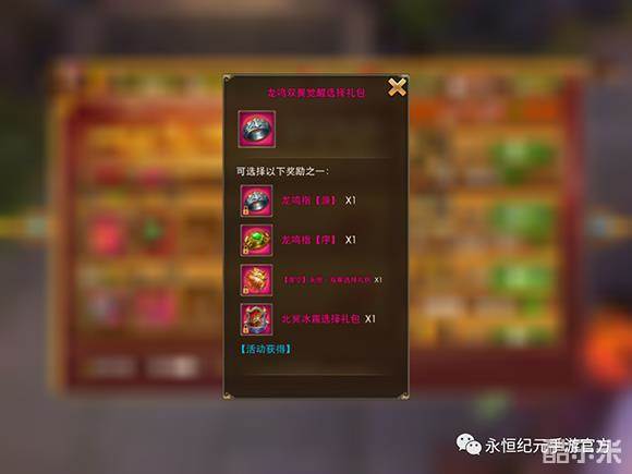打开龙鸣双翼觉醒选择礼包可以选择龙鸣指【源】、龙鸣指【序】、【虚空】永恒·双翼选择礼包、北冥冰霜选择礼包之一。