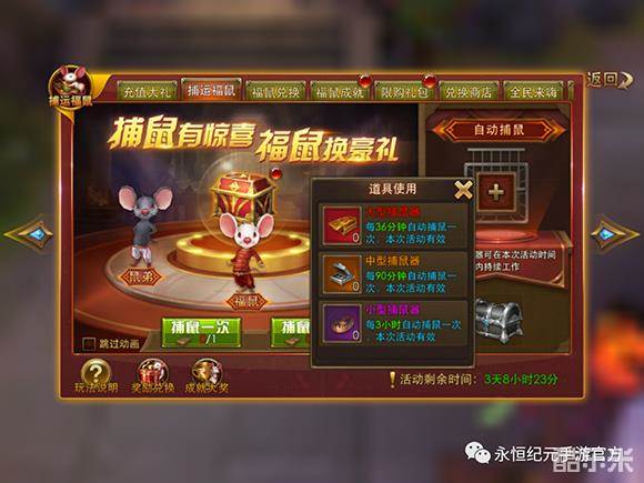 消耗捕鼠夹进行捕鼠,捕鼠有概率获得福鼠兑换所需的兑换道具,还有几率获得惊喜大奖,放置捕鼠器可以在本次活动时间内自动捕鼠,越高级的捕鼠器,捕鼠效率越高哦。