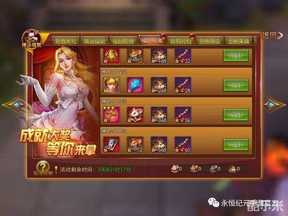 连续登录1、2、3天以及在捕运福鼠处进行捕鼠,均可完成福鼠成就,完成成就后可获得超值成就奖励!不仅可获得福鼠、金鼠、鼠小弟、鼠来宝,还能获得镜宇之士、幻彩三星圣物选择礼包、莉莉弗洛之心选择礼包等强力道具!