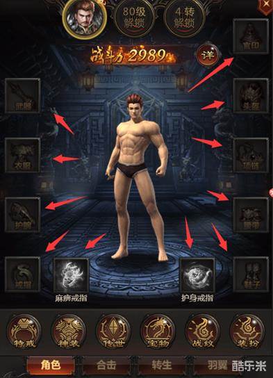角色件装备工11件,基础装备8件和2个特戒和一个官印。系统功能包含特戒、神装、传世、宝物、装扮、战纹、角色,合击,转生,羽翼;