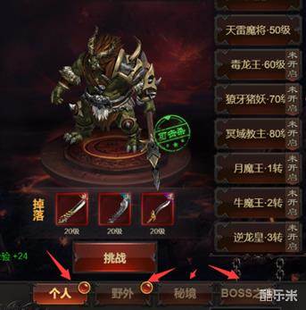 BOSS系统:这个玩游戏的大家都是明白的,就是杀BOSS爆装备材料什么的,这个没什么好说的,但是主要介绍一下野外BOSS是可以PK的,这个只要参与击杀BOSS就可以获得奖励,只有第一奖励是最好的,秘境BOSS只有归属玩家才可以获得奖励,BOSS之家只有VIP2以上玩家可以打,每2个小时刷新一次。