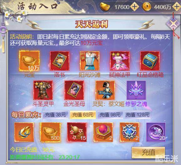 1.新版天天返利:原天天返利活动奖励升级,增加30、68、98、128累计充值档位,次日刷新累计金额