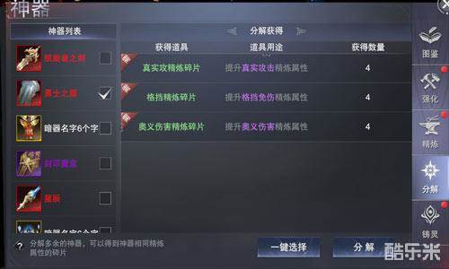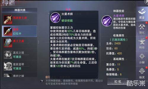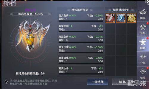 当前版本奥义伤害属性主要来源为神器精炼及翅膀羽灵,神器精炼有个小技巧:每个神器初始具有三条随机精炼属性,可以点击道具图标在tips中查看到,如果这三条属性中包括了奥义伤害,就可以直接分解,获得奥义伤害精炼碎片。