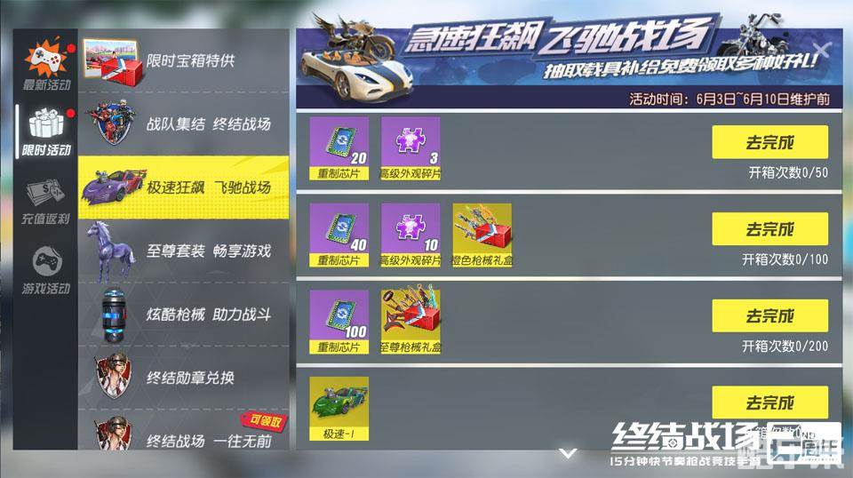 在广阔的《终结战场》上,一台得心应手的跑车是探索地图、获得补给、联合队友的必备工具。本周更新后,玩家通过抽取“载具补给-炽热极速”将有几率获得跑车外观“极速-I”,“极速-I”继续升级可得到传奇载具外观“炽热极速”。
