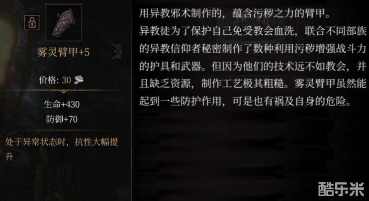 雾灵臂甲也是一个+5的抵抗类的装备,装备的效果是可以增加430的生命值和70的防御值,特色的效果是当角色处于异常状态的时候,可以大幅度的提高各项部门buff的抗性,比如说毒抗等等。