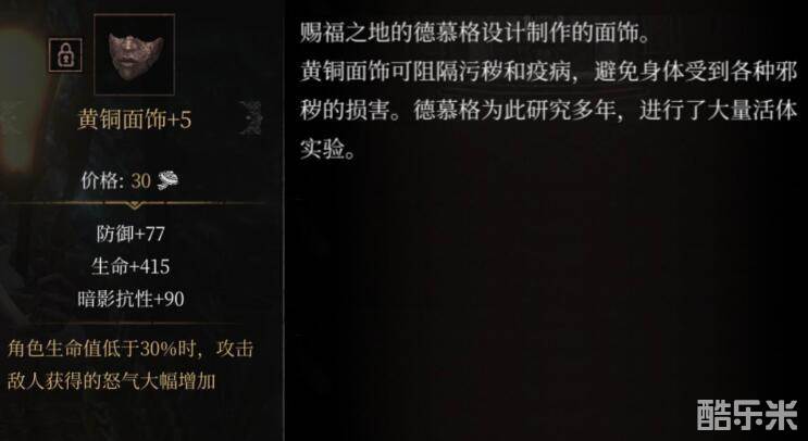黄铜面饰的效果是加血加防加暗抗,同时这个装备的特色效果是可以在角色的生命值低于30%的时候,攻击敌人时候会获得大幅度的怒气值的增加。