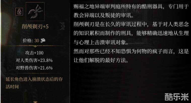 这把武器是赐福之地的酷刑器具的原型,效果是能增加100的攻击力,同时对人类有额外的23.8%的伤害,以及对野兽也有21.6%的额外伤害。特殊的作用是可以延长角色进入崩溃状态后的存活时间。