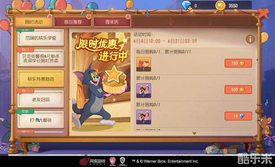 在喜气洋洋的周年庆中,快乐特惠商店限时开启,汤姆为客人们带来了皮肤礼盒、星星、邮票等特惠商品。感人的打折力度,让你以最优惠的价格将心动商品收入囊中。商品限购,售完即止,快快把握机会,享受惊喜折扣吧吧!