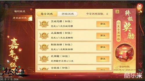 “老史的试炼”系列任务分“每日试炼”和“终极试炼”2种。其中,每日试炼需要玩家完成不同次数的运镖、刺探、搬砖、武神殿等日常活动;任务必须在当日完成,过后则会刷新新任务。终极试炼没有时间限制,需要玩家参与多次国战、家族战、家族活动,或是累积杀敌来完成,获得大量试炼经验,活跃玩家轻轻松松就能拿到终极神装奖励!