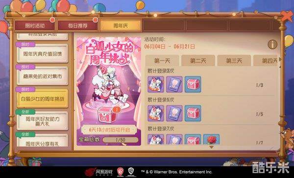 图多盖洛穿上粉嫩的裙子,化身毛茸茸的可爱白狐少女,前来参加生日派对啦。完成白狐少女的周年挑战任务,可以获得A级图多盖洛·白狐少女皮肤碎片、明信片、周年挑战宝箱等好礼,收集50个白狐少女碎片即可免费获得完整的A级皮肤图多盖洛·白狐少女!