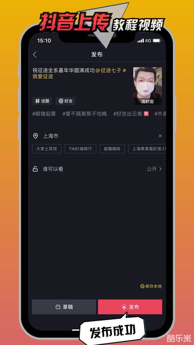 4、上传视频加入话题#我爱征途,并标记地标(所在城市,如:宿迁)
