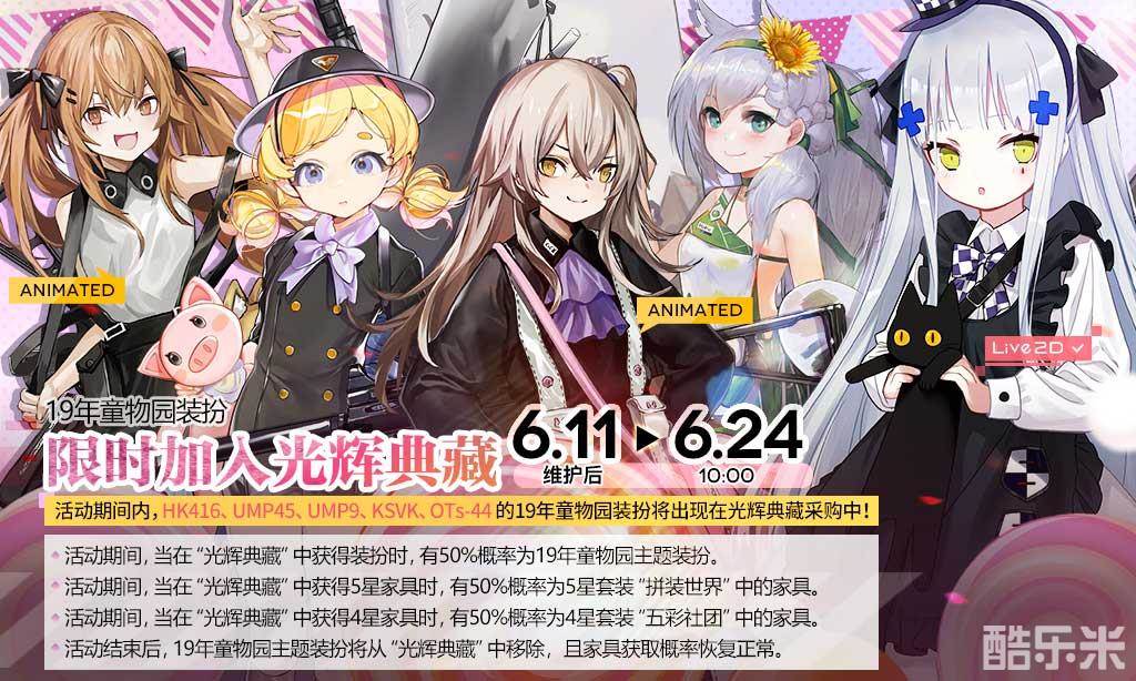 在6月11日维护后-6月24日10:00期间,5件19年童物园主题装扮将限时加入“光辉典藏”!活动期间,在“光辉典藏”中获得装扮时,有50%概率为19年童物园主题装扮。其中五星家具套装“拼装世界”&四星家具套装“五彩社团”的获取概率也同步提升,详细规则请看图片介绍!