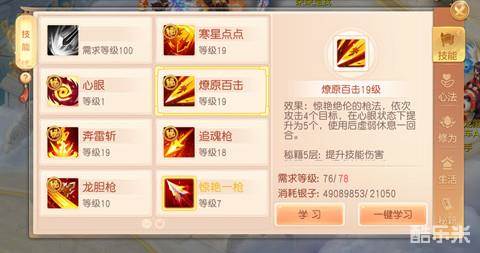破军进入心眼状态,接下来的多回合将获得伤害加成,并且免疫受到的一次技能效果。寒星点点,舞动长枪造成群体物理伤害;燎原百击,惊艳绝伦的枪法,依次攻击4个目标,在心眼状态下提升为5个;怒气技,惊艳一枪,攻击单个敌人造成物理伤害。