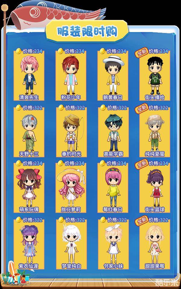 活动期间,以下服装限时出售,包含全新服装:街头嘻哈、纯纯夏萤等!
