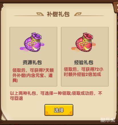 3、额外补偿:合并结束后,非基准服角色可额外选择一份 补偿奖励(资源补偿礼包、经验加成礼包 可根据自身需要选择一种)
