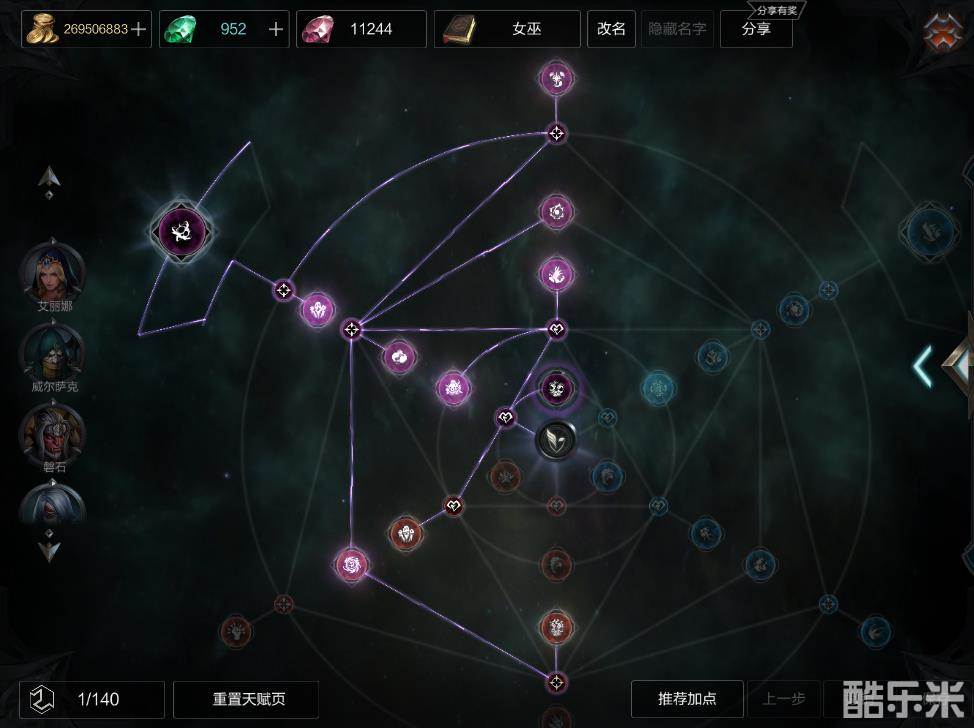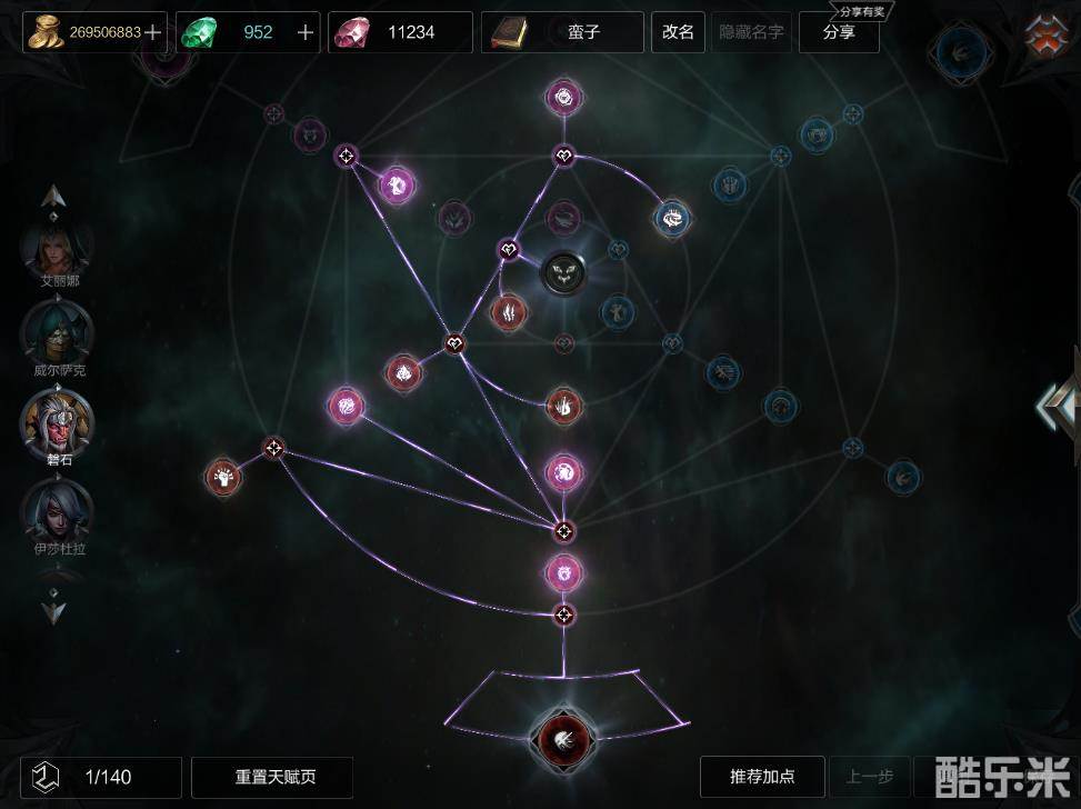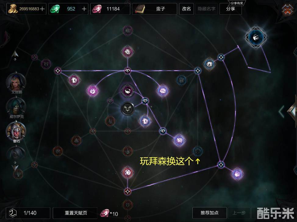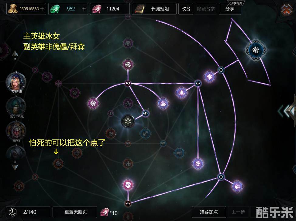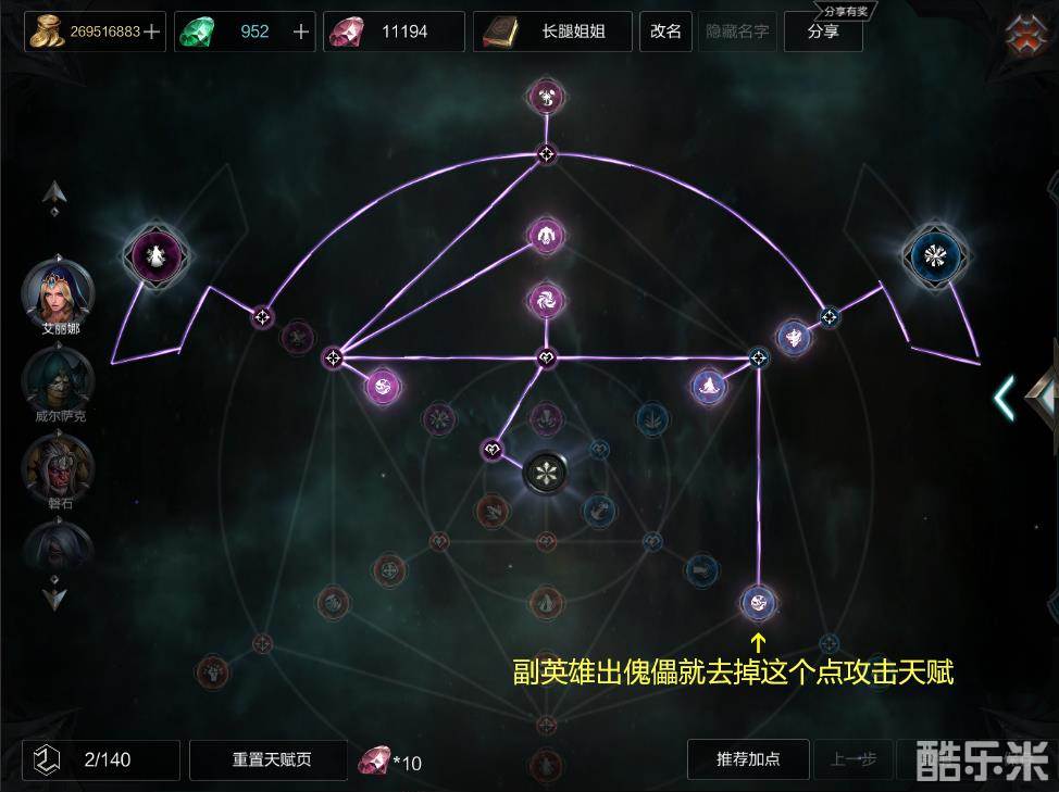 说明:这里没点回蓝天赋,所以副英雄最好出个傀儡或冰女。要是既没回蓝装备、也不出战这两个英雄,那就把“疾影·专注”点了。回血靠副英雄傀儡,如果不出傀儡就把“疾影·回复”点了。