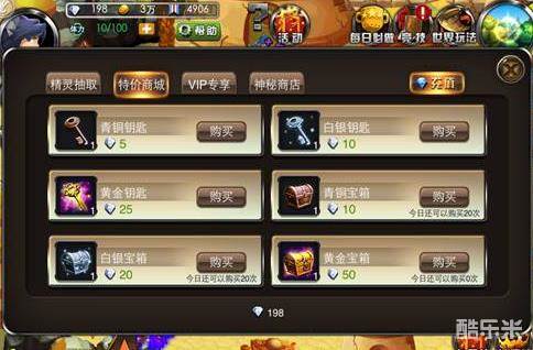 第二个栏位是特价商城,里面有我们每天消耗钻石的最好去处——购买体力、金币、经验和最重要的宝箱。在这里阿风建议各位可以考虑小充一笔钱,10块获得一个VIP1除了能领取钻石和大量福利以外,最关键的就是可以在特价商城这里购买到更多物超所值的东西了。