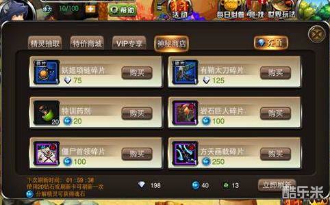 至于最后的神秘商店,我们可以用分解蓝紫级别精灵获得的魂石或者钻石,在这里购买到装备和宠物碎片、特训药剂、进阶石、精炼石等等。