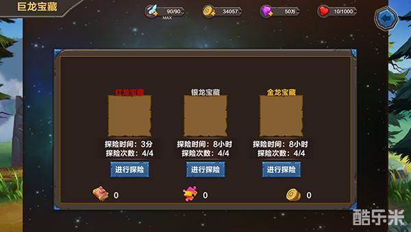 2. 宝藏按奖励基础高低分为三种:红龙宝藏,银龙宝藏,金龙宝藏。宝藏根据品质高低需要的寻宝时长也增加,越高级的宝藏需要的寻宝时间越长。