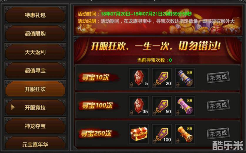 活动说明:活动期间,在龙族寻宝中,寻宝次数达指定数量,即可领取额外大礼。