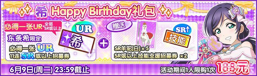 包含『[东条希限定]必得一张UR11连SR或以上招募券』的「希happy birthday礼包」也将登场!