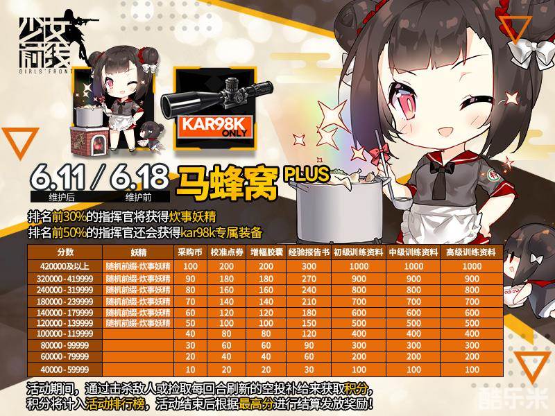 亲爱的指挥官们,“马蜂窝PLUS”即将开启!本次活动为仅包含“马蜂窝PLUS”关卡的复刻活动,但是关卡难度和敌人进行了全新调整!在该关卡中击杀敌人或捡取每回合刷新的空投补给即可获得积分,按照单次到达的最高积分,可以在活动结束后获取不同的积分奖励,积分达到12万以上,将可获得活动限定“炊事妖精”,其他奖励包括采购币、校准点券和高级训练资料等!同时,积分还会计入活动期间出现的活动排行榜,活动结束后将根据您的最高积分进行结算并发放对等奖励,有机会获得Kar98k专属装备和厨神型炊事妖精哦!详细的排行榜奖励请见下图!