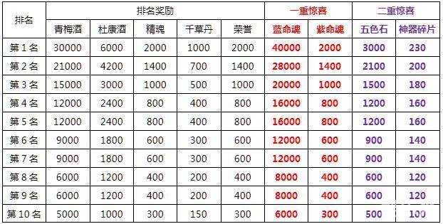 2. 活动期间累计充值金币达到10000金币,可以额外领取一重惊喜奖励(蓝命魂,紫命魂);