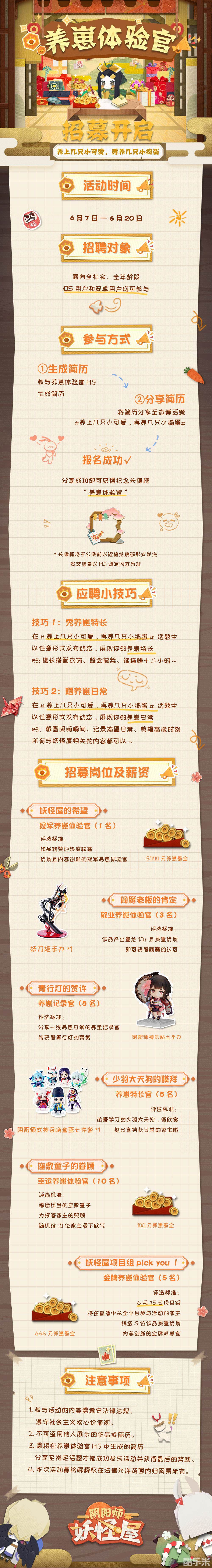 本次活动为官方招募妖怪屋养崽体验官,据说只需要吃饭陪玩,钓鱼rua猫,工作轻松,休闲养崽,还有超多奖励可以获得!