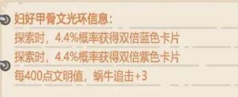妇好甲骨文的光环作用是在探索的时候可以有4.4%的概率获得双倍的紫色卡片和蓝色卡片,并且蜗牛每有400点的文明值可增加3点的追击。