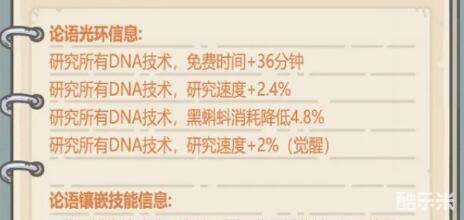 论语是中国古代的必学的教材之一,在最强蜗牛的世界中是一个SSS的贵重物品,可以增加蜗牛107的文化值和82的艺术值。论语的光环信息是在研究所有的DNA技术时可以增加36分钟的免费时间,并且提高2.4%的研究速度,加上黑蝌蚪的消耗可以降低1.8%,同时觉醒之后可以额外再提高2%的研究速度。