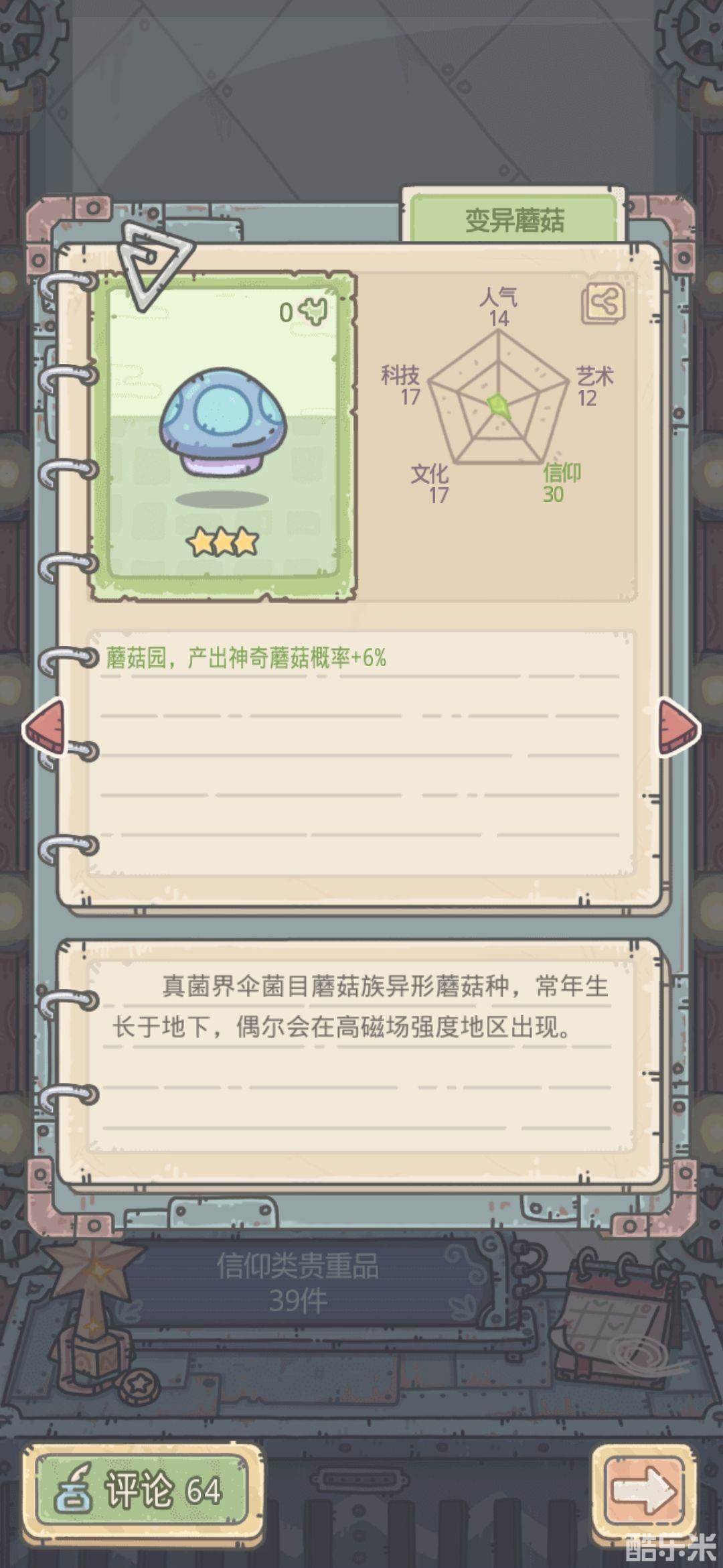 在蘑菇园中会随机出现一个贵重品蘑菇,这个蘑菇加成还是挺不错的,至于什么时候出现并没有明确的时间,大家只能随机等待获得了,另外游戏中还有很多可以发现彩蛋的地方哦。