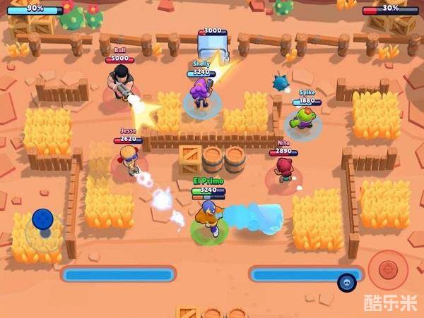 荒野决斗模式,既需要操作也需要策略,一局10人的设定,玩家可以单枪匹马或是双人成组式,游戏中有一个类似“吃鸡”类热门游戏中的毒圈,随着毒圈不断缩小,淘汰其他玩家,努力生存至最后即可成为赢家。另外,地图中还有宝箱、草丛、围墙等多种元素,打宝箱可升级英雄属性,草丛中处处危机四伏,充分利用地图元素制定作战方案,让你一直“吃鸡”一直爽,分分钟就上头!
